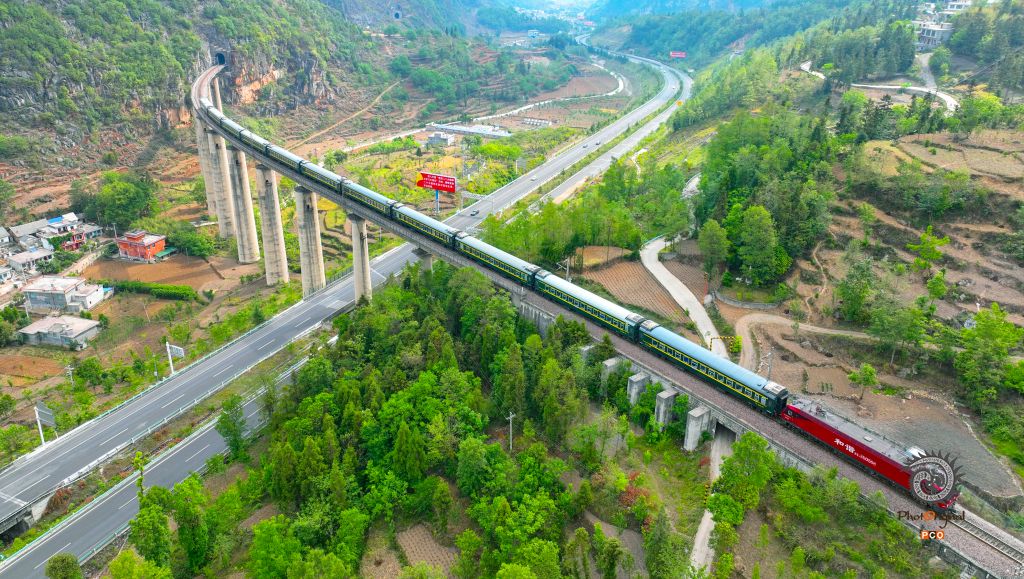 贵州省六盘水市盘州市境内水柏线雨格铁路桥跨越水盘高速上而过。