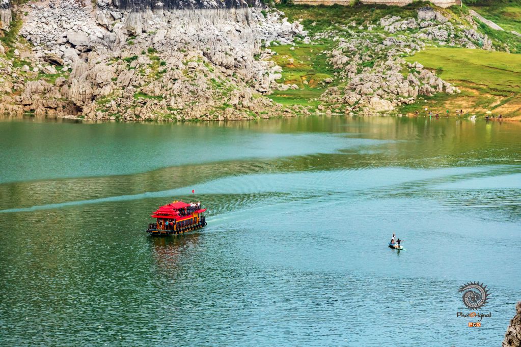 在万峰湖吉隆堡附近水域,前来游玩的游客乘坐的游轮与当地打鱼的夫妇同框,展现出一幅自在生活的美好画面。