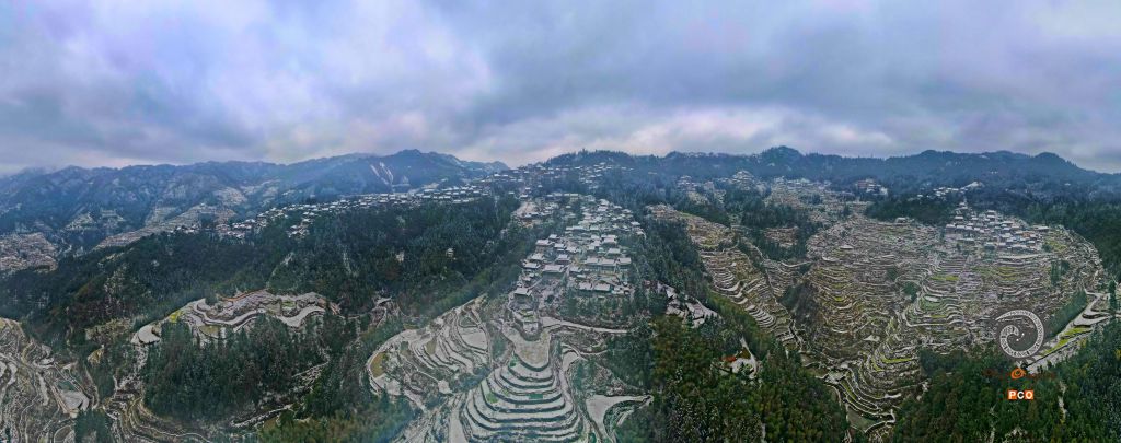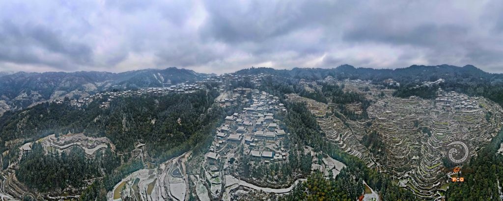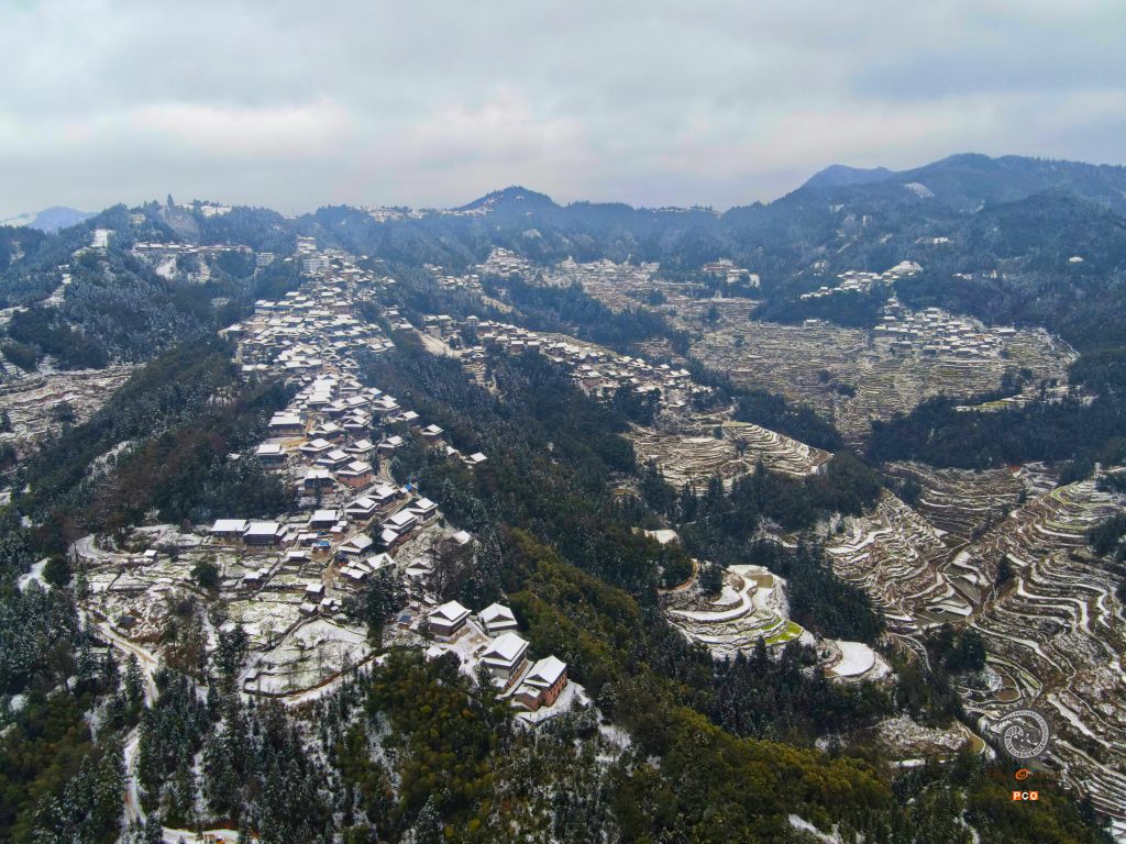 2022年立春之雪,在雪的映衬下,一幅雪白的山间田园画卷映入眼帘,梯田之上的传统村落美不胜收。2022年2月拍摄于贵州省从江县下江镇中华村,拍摄人:潘文胜,联系电话18212399140.