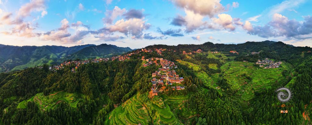 临近中华村,远远望去,首先映入眼帘的是落位于两条山脊之上,呈"Y"字型分布,寨子周围群山环绕,村寨依托山形,整体呈坐南朝北之势,形成东西向的村赛主轴线;整体呈平行于务落山、引故多山体结合地形予以展开。村寨周边丛林密布,夹冲沟谷间,梯田重叠,层层而上;村落依山傍水,寨边古树参天;千阑式木质房屋,鳞次栉比。拍摄于2022年6月贵州省从江县下江镇中华村,拍摄人:潘文胜,联系电话18212399140