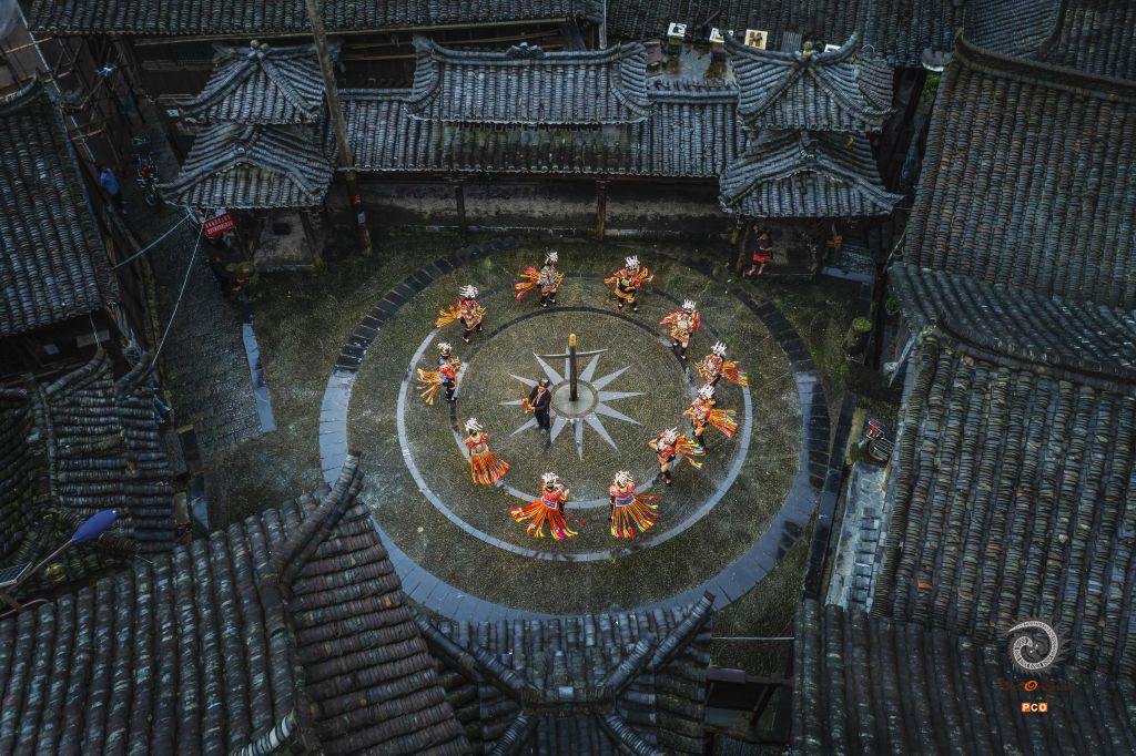 2021年7月2日摄于贵州省黔东南州凯里大塘镇新桥村。 锦鸡舞来自锦鸡苗族。锦鸡苗族是苗族的一个分支,属于亚族群,自称旮弄(又写嘎闹),因崇拜锦鸡(凤凰图腾)并在重要节日和祭祀活动中跳锦鸡舞而得名,主要聚居在贵州东南部。 “水上粮仓”是新桥苗寨的标志性景观,而短裙苗锦鸡舞这一独具特色的苗族传统的祭祀性舞蹈向人们展示的是苗族人民自古对于飞鸟图腾的崇拜和向往。