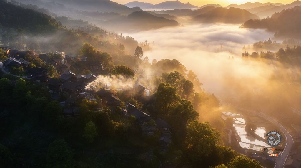 贵州省剑河县少数民族村落基佑村早晨迷雾缭绕、风景如画。 摄影:罗子钧,电话13985291365,2022年5月3日摄于剑河县基佑村。