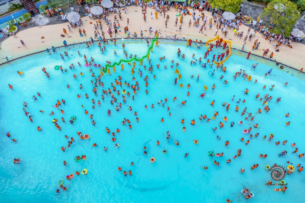 在剑河温泉景区,前来避暑游玩的游客与“水龙”同乐。 《欢乐大本营》+罗子钧 摄+13985291365+2021年7月17日摄于剑河县温泉景区(DJI_0497)