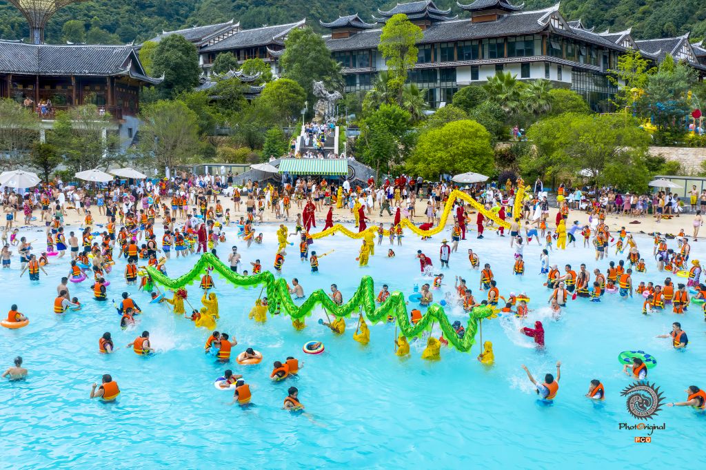 炎热的夏季,剑河县温泉景区,前来避暑旅游的游客与“水龙”同戏。 《欢乐的夏天》+罗子钧 摄+13985291365+2021年7月17日摄于剑河县温泉景区(DJI_0493)