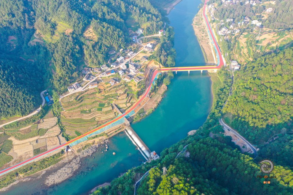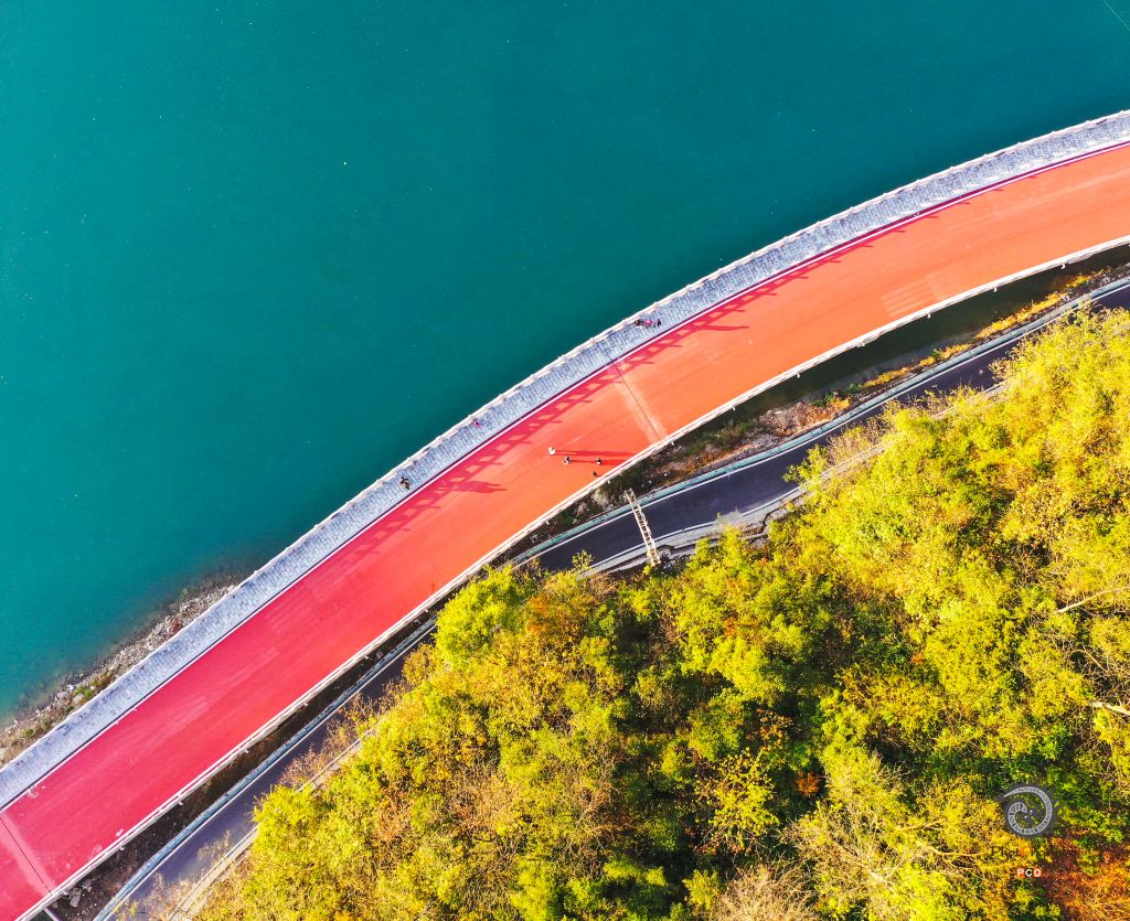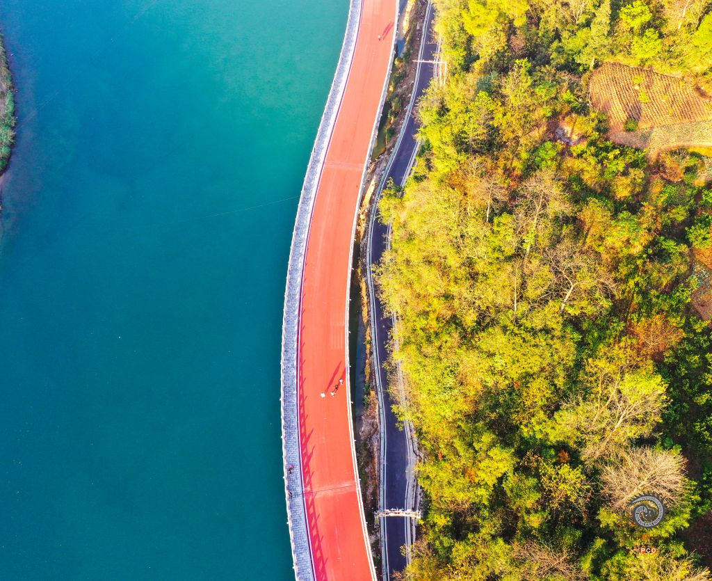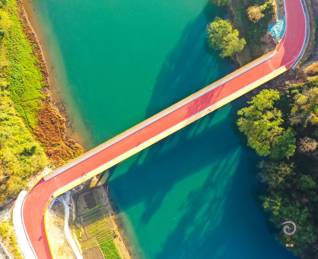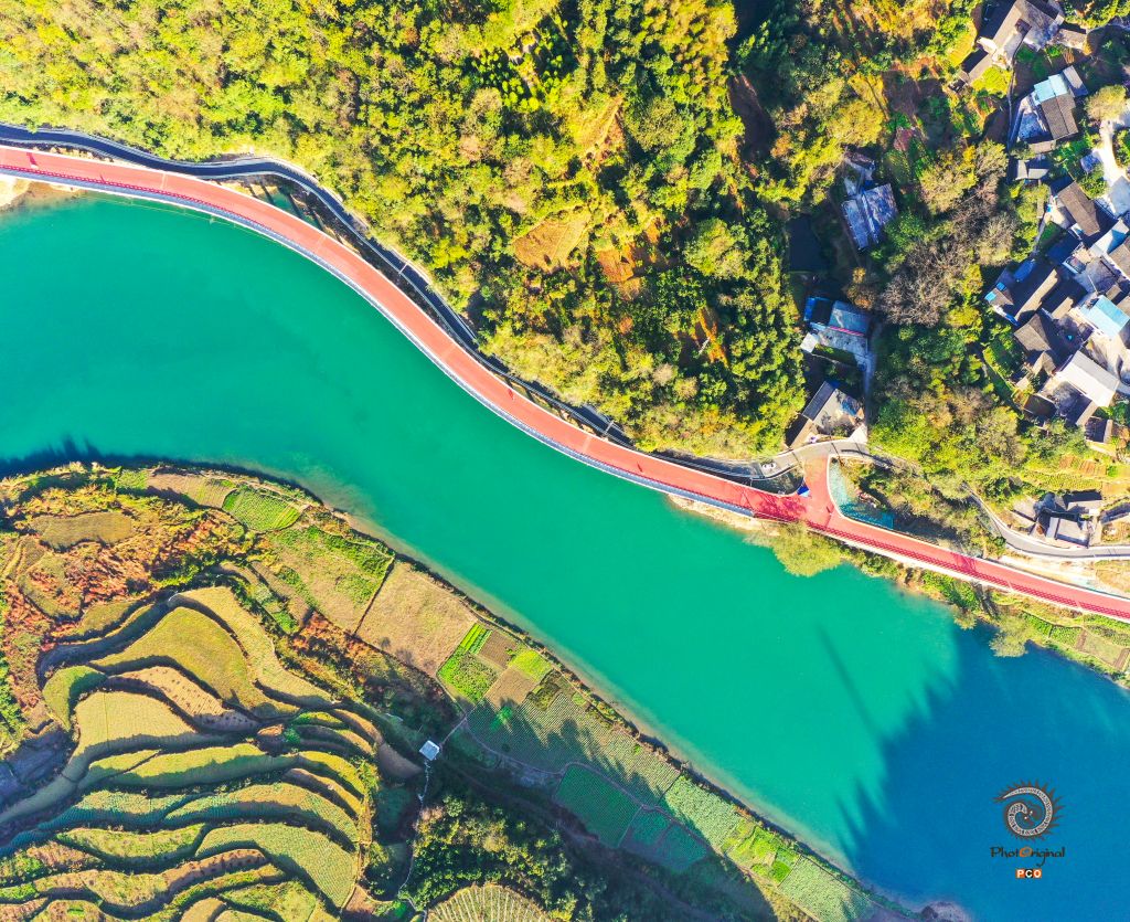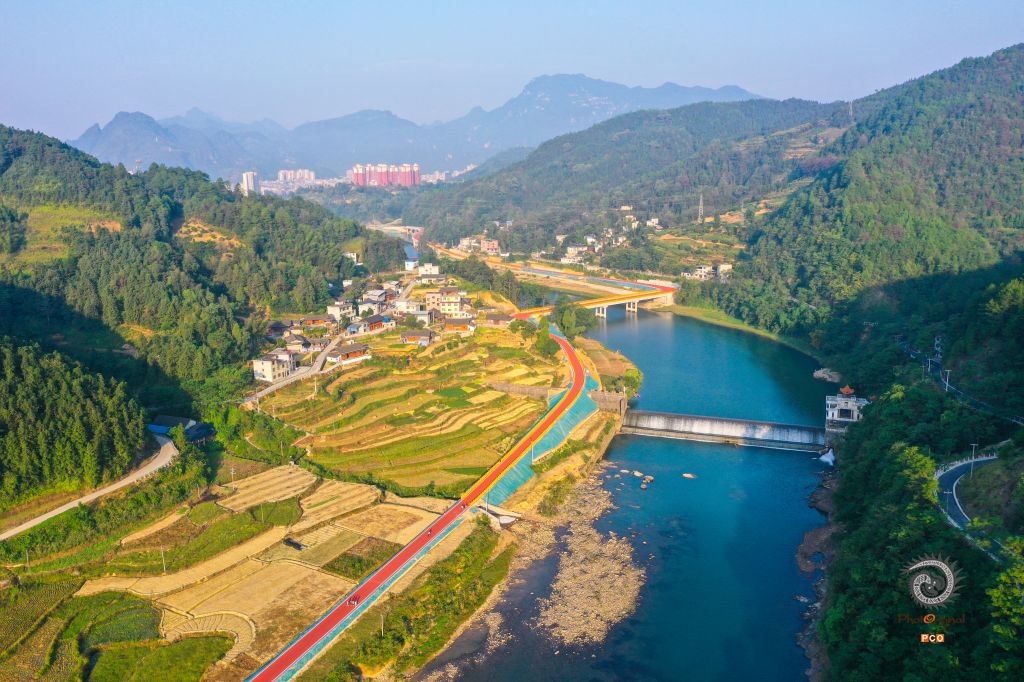 近年来,铜仁市依托梵净山旅游资源优势,大力实施“一带双核”发展战略,不断发展壮大乡村旅游产业,推动旅游产业高质量发展。规划建设碧江区八官溪至江口县两河口乡村振兴农耕文化旅游带,打造集乡村旅游、户外运动、康养娱乐、体育赛事等为一体的山水相依、景田相望的慢行系统工程,全线长43.7公里。从空中俯瞰,绿道就好似一条多彩的绸缎和绿色的河流并驾齐驱,与两岸青山绿水相映成趣,美不胜收。