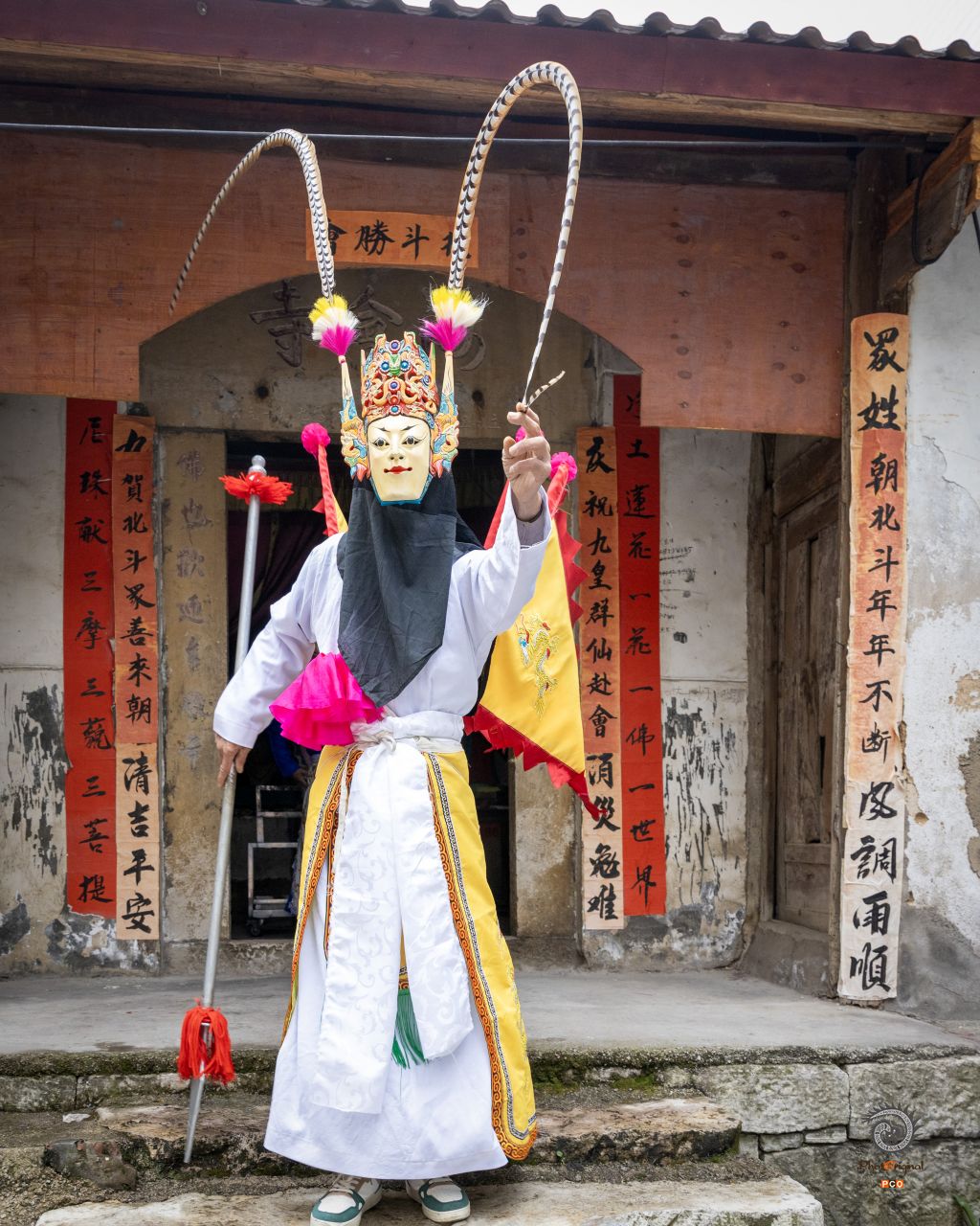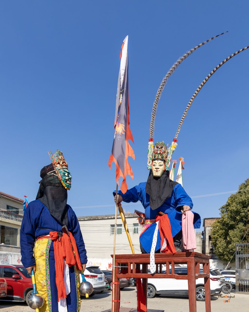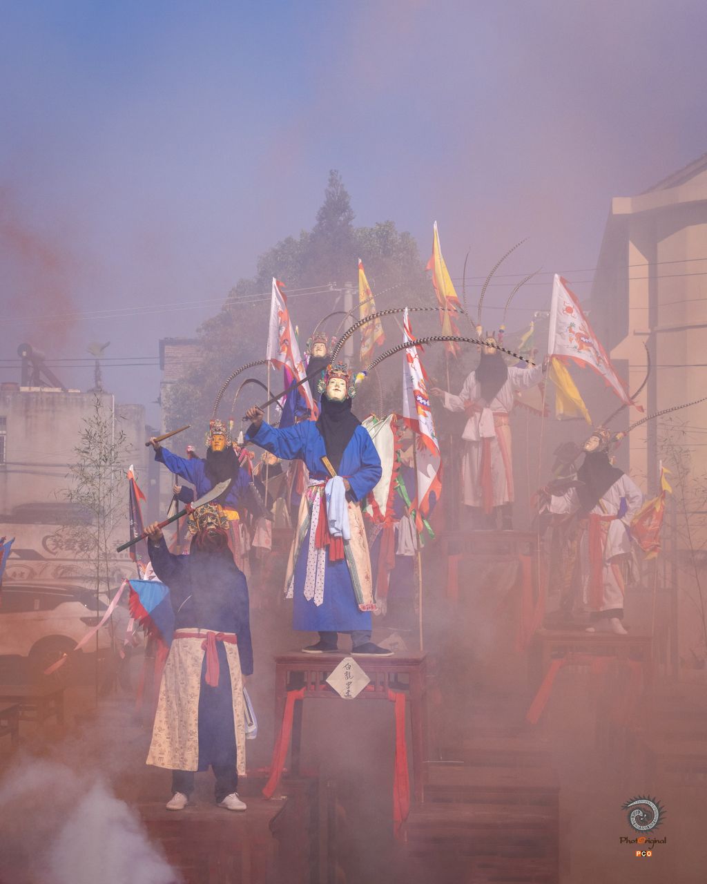 镜头聚焦安顺新阳坡木高台地戏,以仰角捕捉表演者立于高台的英武身姿,铠甲银饰在日光下泛着古战场的凛冽光泽。特写脸谱上的油彩与眉宇间的张力,远景收进台下村民的凝神注视。快门定格于腾跃瞬间的衣袂翻飞,让六百年军屯记忆在高台之上,借铿锵舞步与炽热目光,完成一次与历史的对话。