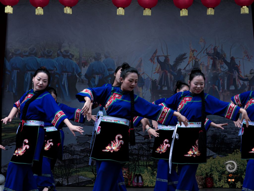 舞台之上,身着传统服饰的舞者们,以灵动舞姿演绎民族风情。蓝色衣装搭配刺绣裙裳,纹样精美,尽显文化底蕴。背景里,古意场景与红灯笼呼应,营造浓郁氛围。她们的动作整齐舒展,传递着民族的热情与活力,将传统艺术融入现代舞台,展现非遗舞蹈的独特魅力,让观者沉浸式感受民族文化的传承与绽放,见证传统与艺术交织的动人瞬间 。