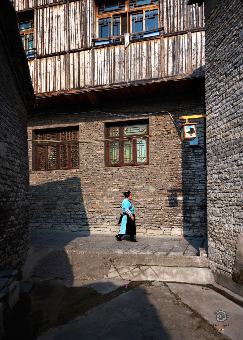 一位身着屯堡服饰的妇人走过屯堡巷道。