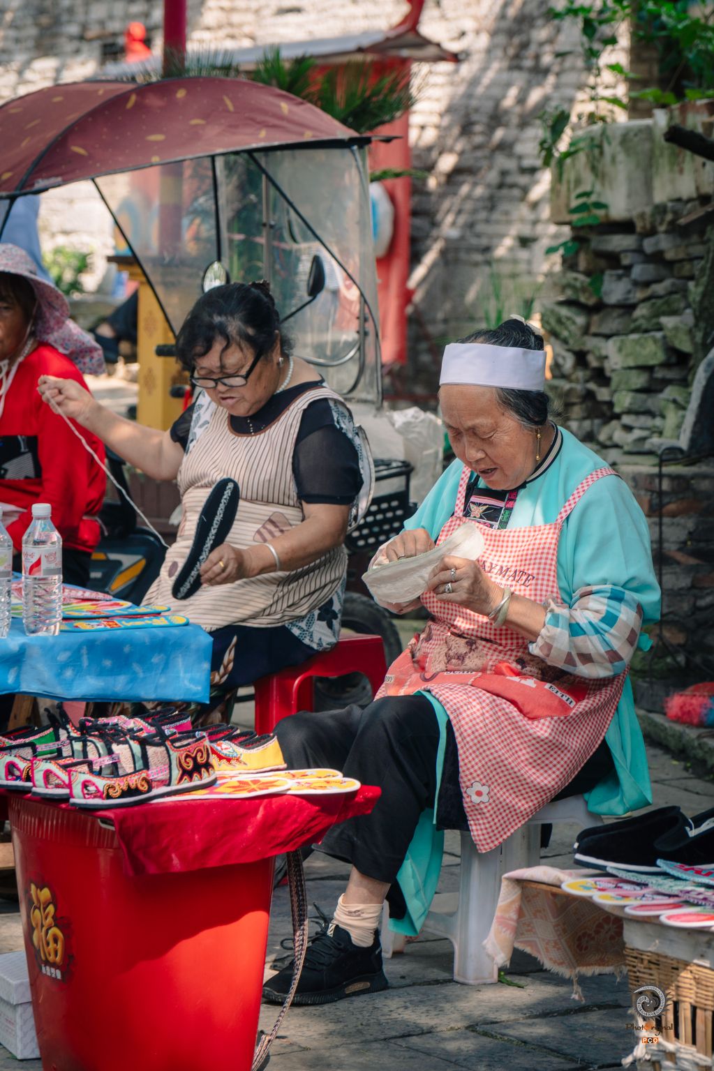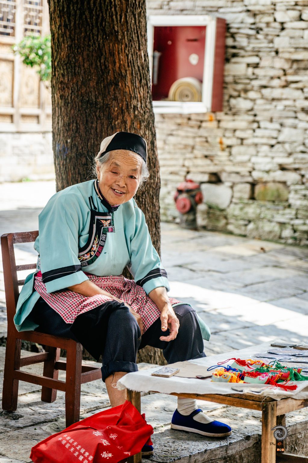 天龙屯堡古镇以石墙木屋、石板街巷为幕,传统服饰、刺绣手作与“葉茂思根”石碑相映,老者闲坐、生活流转间,活现明代屯军后裔“守根脉、续烟火”的民族风貌。 图一:银发老人戴黑帽、穿蓝底绣花上衣,坐石墙木椅,膝前木桌摆彩色手作,身后绿植与斑驳石墙相映,定格屯堡人“慢坐光阴”的日常。 图二:蓝衣老人束白腰带,沿石径而行,石墙木构间漫溢古村烟火气。 图三:两女性围红白格围裙,一摆弄手作、一穿针引线,脚边红底彩绣布鞋静置,石墙绿植为幕,定格“穿针引线”里的手工艺传承。 图四:“葉茂思根”石碑静立,几位老人或坐谈或远眺,身后古树浓荫、红灯笼垂墙,石墙斑驳间,写满屯军后裔“寻根守土”的深情。