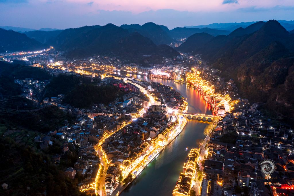 夜色像一块浸了墨的宣纸,悄然铺展在古镇之上。舞阳河的水泛着幽幽的蓝光,如同一条玉带蜿蜒穿过古镇。两岸的灯火次第亮起,星星点点,又连成一片,将河水染成了翡色。水倒映着两岸灯笼与霓虹,如打翻的画板渲染出层层叠叠的色块,船行过处荡起粼粼波光,仿佛载着星河穿行于水墨丹青之间。2024年3月27日无人机拍摄于贵州省黔东南苗族侗族自治州镇远古镇。
