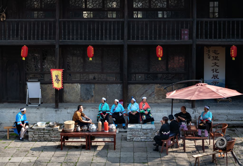 屯堡的婆婆们热情邀请游客们喝茶,游客们与婆婆们坐在一起开心的聊天。