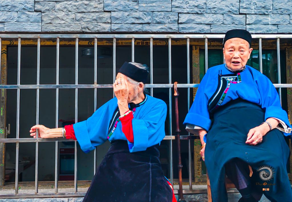 2022年8月20日我到安顺市天龙屯堡景区游玩,偶遇两位身穿汉服精神矍铄的老人,她们正坐在路边交谈,她们的汉服衣装非常干净漂亮,我情不自禁的拍下了这一张珍贵的片子,其中一位老人见我在拍她们,害羞的用手遮挡了一下自己的脸,我拍完后随即于两位老人聊了好一会,了解到她们这身汉服服装已经传承了600多年了,她们也非常喜欢自己的服装,平时生活里几乎都穿着。