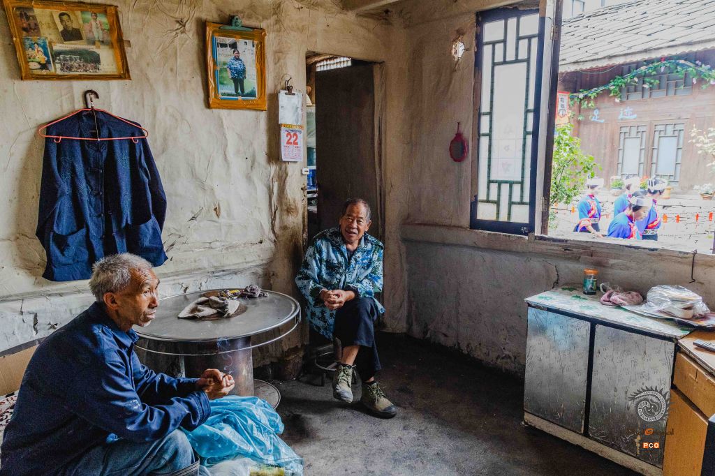 2025年6月23日,贵州省安顺市旧州镇,古镇一户居民在家中聊天,窗外走过身穿屯堡服装的妇女。