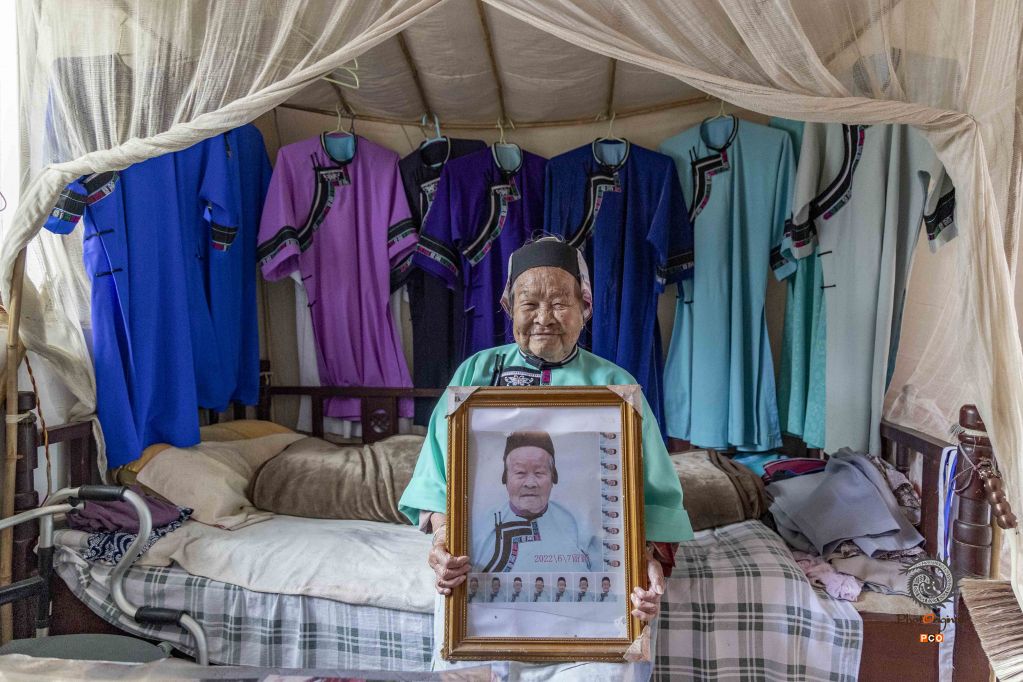 2025年6月29日,贵州省安顺市,一位身着凤阳汉装的老人在卧室中与自己的照片合影。