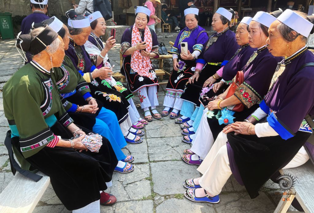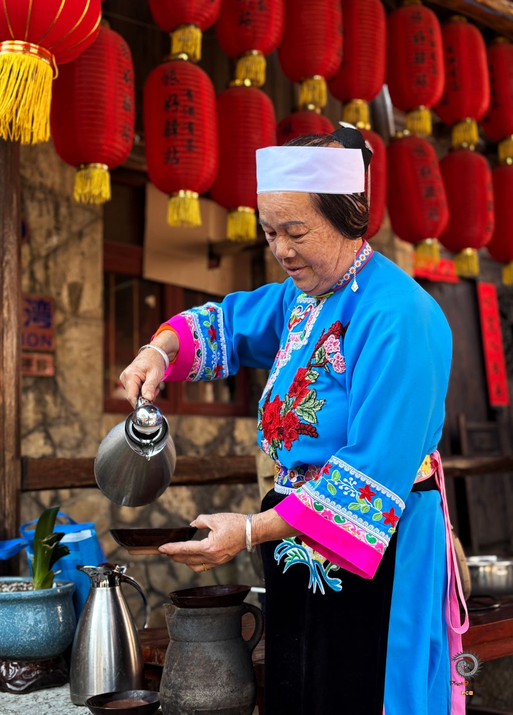 镜头聚焦安顺市平坝区天龙古镇,明代军屯后裔的“文化活化石”。身着“凤阳汉装”的奶奶专注斟茶,氤氲茶香凝固时光;傩面覆脸的地戏演员在锣鼓中演绎忠勇传奇;街巷间,蓝袍大袖的奶奶们步履从容,身影如行走的明代风俗画。本组照捕捉屯堡人在日常烟火中,对六百年江南故俗的鲜活守护。
