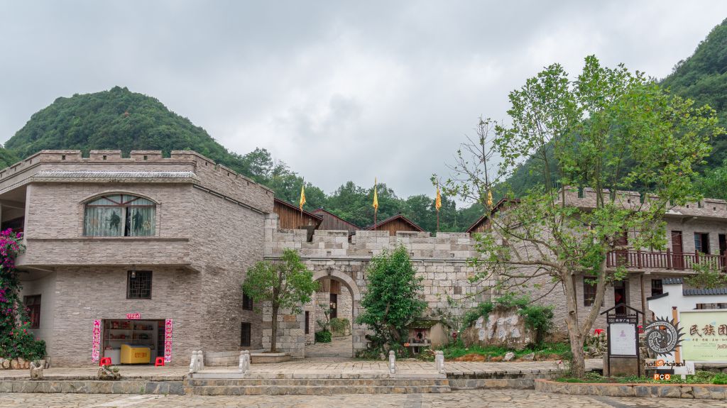 贵州安顺阿歪寨村是布依族传统村落,位于安顺经开区幺铺镇。该村是三国藤甲兵后裔栖居地,至今保留藤甲编织技艺。村落依山而建,石板路、石墙民居错落分布,布依族刺绣、古法造纸等非遗文化鲜活传承。 图一:古寨门庭 青灰石墙、木构老房围合石板广场,山影浮云里,静泊乡居日常。 图二:乡愁巨石 深灰巨石静卧草坡,“阿歪古寨 留住乡愁”字迹斑驳,野花攀石角,刻下乡土记忆。 图三:守寨武士 黑甲武士雕像擎黄旗立林间,藤甲头盔、长矛静指苍穹,凝住古寨精神脉络。