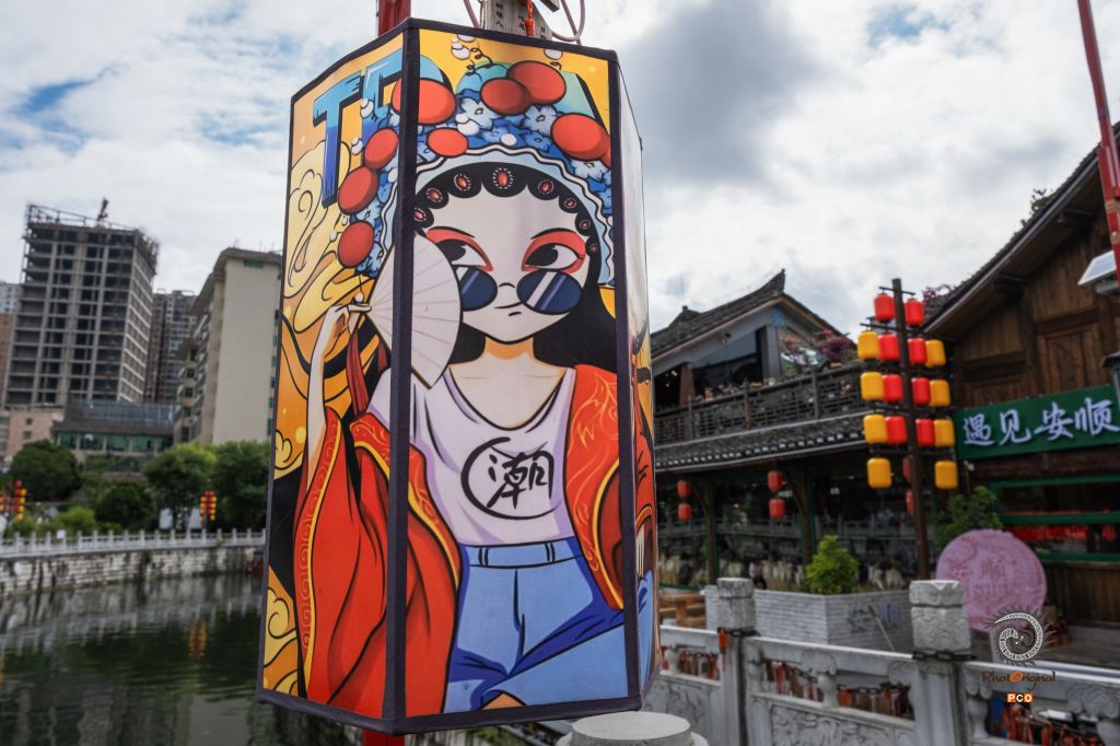 一盏绘着身穿戏服元素却又搭配现代潮流服饰的人物形象的灯饰,将两边古香古色的建筑与现代高楼连接起来,像是一座无形的桥梁,连接了安顺这座充满魅力的古城的过去与现在。
