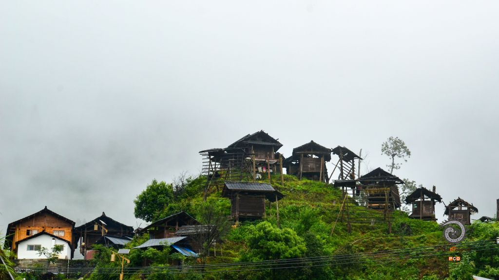 拍摄于2020年5月29日的从江县加纠乡,当时正值插秧季节,雨后的天气湿润,远眺晾晒糯禾的禾苍耸立在农家屋后的山脊上,这些用树木搭建起来的简易禾苍,稳固地支撑着整个苍体结构,诉说着一个个丰年的故事。