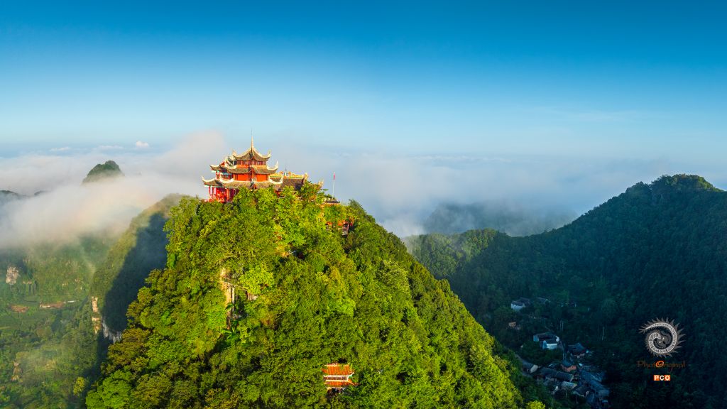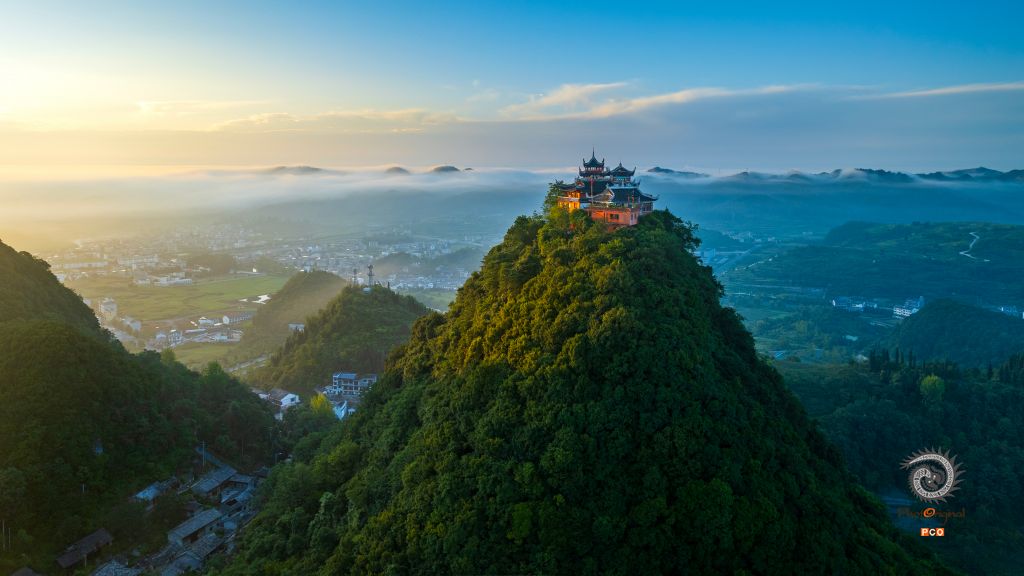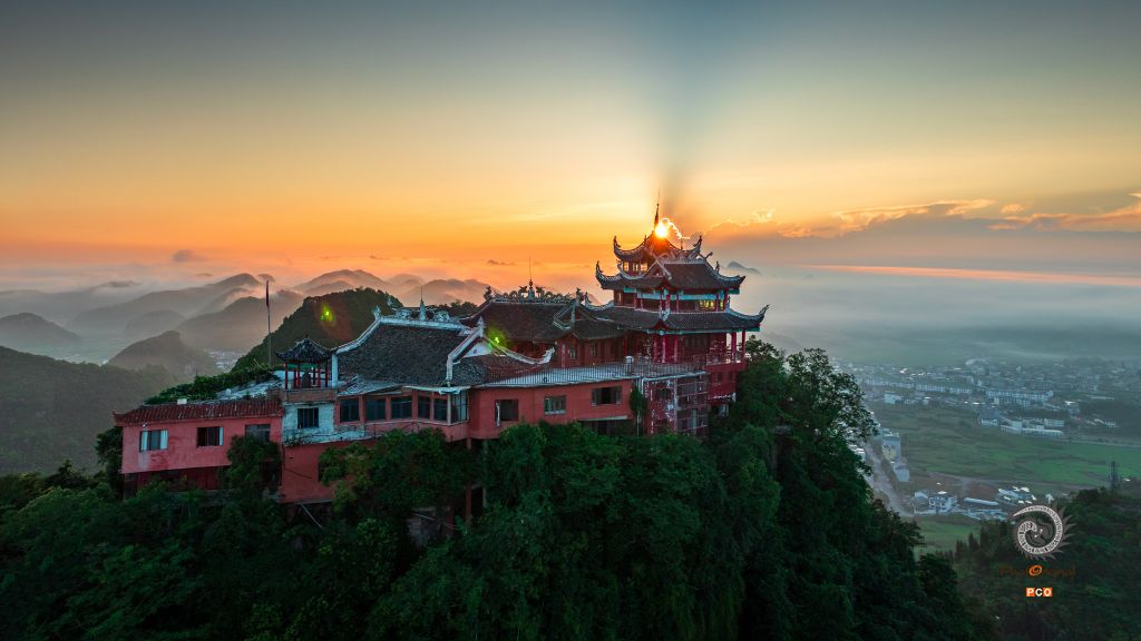 云鹫寺宛如一颗遗落人间的明珠,傲立在峰巅之上,俯瞰着广袤大地。这座古寺身披绚丽霞光,朱红色的墙体与传统中式飞檐翘角,在青山绿树的簇拥下,显得格外庄重而神秘。云鹫寺周边,群山连绵,云雾如轻纱般缭绕,似是为这片秘境增添了一层神秘的面纱。远处隐约可见的屯堡村落,白墙灰瓦,石板铺路,透着古朴与沧桑。