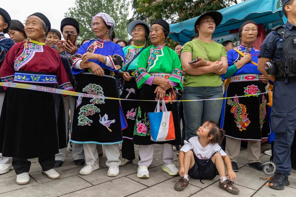2025年6月23日,贵州省安顺市旧州镇举行传统的“抬城隍”活动,广场上正在表演的地戏吸引了众多观众,一小女孩坐在地上观看。