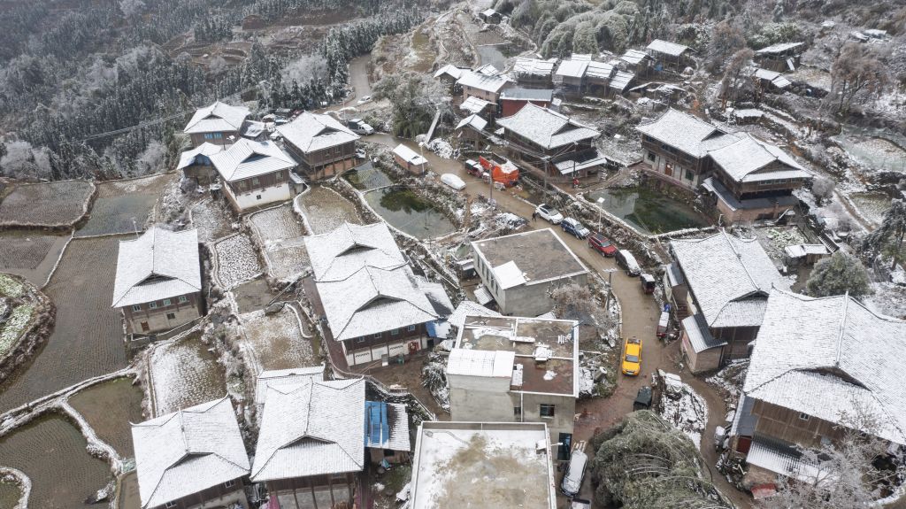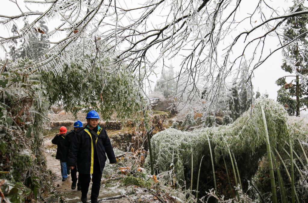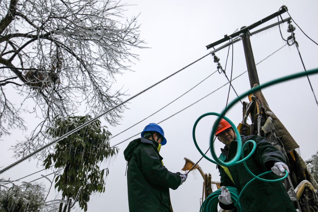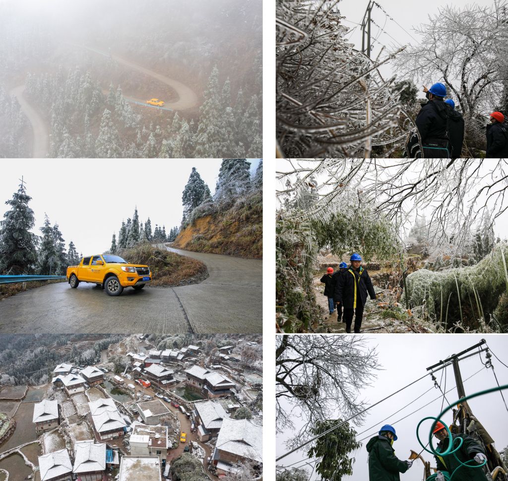 2022年2月1日,大年初一,贵州省黔东南苗族侗族自治州从江县出现低温凝冻天气。从江县电力工作人员坚守岗位,对部分区域进行巡视和检修,保障当地大山群众春节期间安全用电。