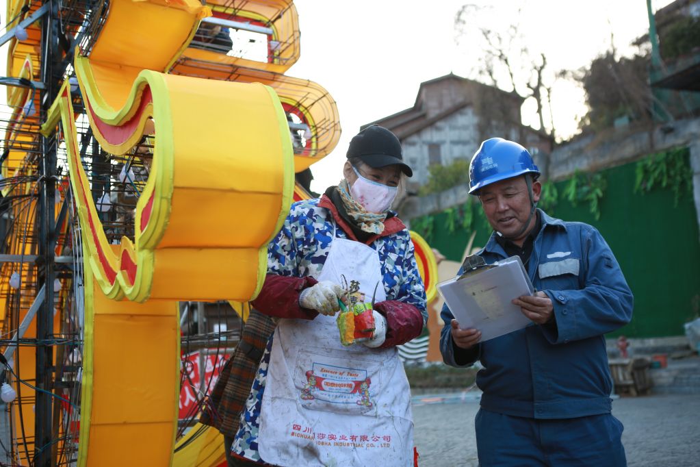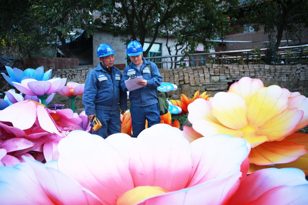2021年1月18日,春节渐近,年味渐浓。在位于贵州省黔东南州凯里市的国家4A级旅游景区下司古镇,来自四川的师傅们正在加紧赶制花灯,南方电网贵州凯里麻江供电局工作人员来到灯展现场,开展人员密集场所安全隐患排查,检查过程中,工作人员向客户详细讲解安全用电注意事项,增强安全用电意识,确保用电安全稳定,电“靓”新春。(王春璇)