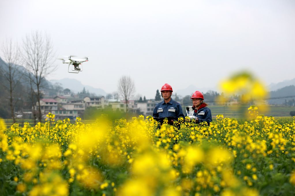 2021年2月25日,南方电网贵州凯里麻江供电局配电所工作人员,在贵州省黔东南苗族侗族自治州麻江县谷硐镇乐坪村,利用无人机对10千伏线路进行风筝触线隐患排查,提高电网安全供电可靠性,提升线路安全运行水平。(王春璇)