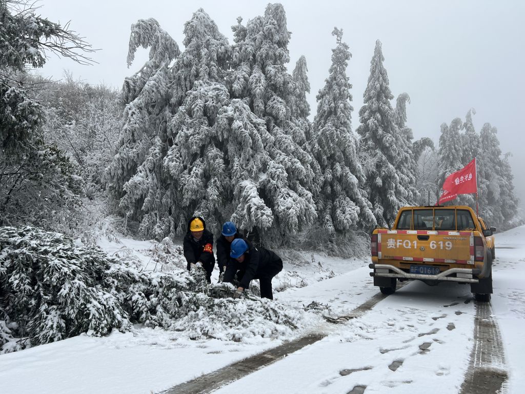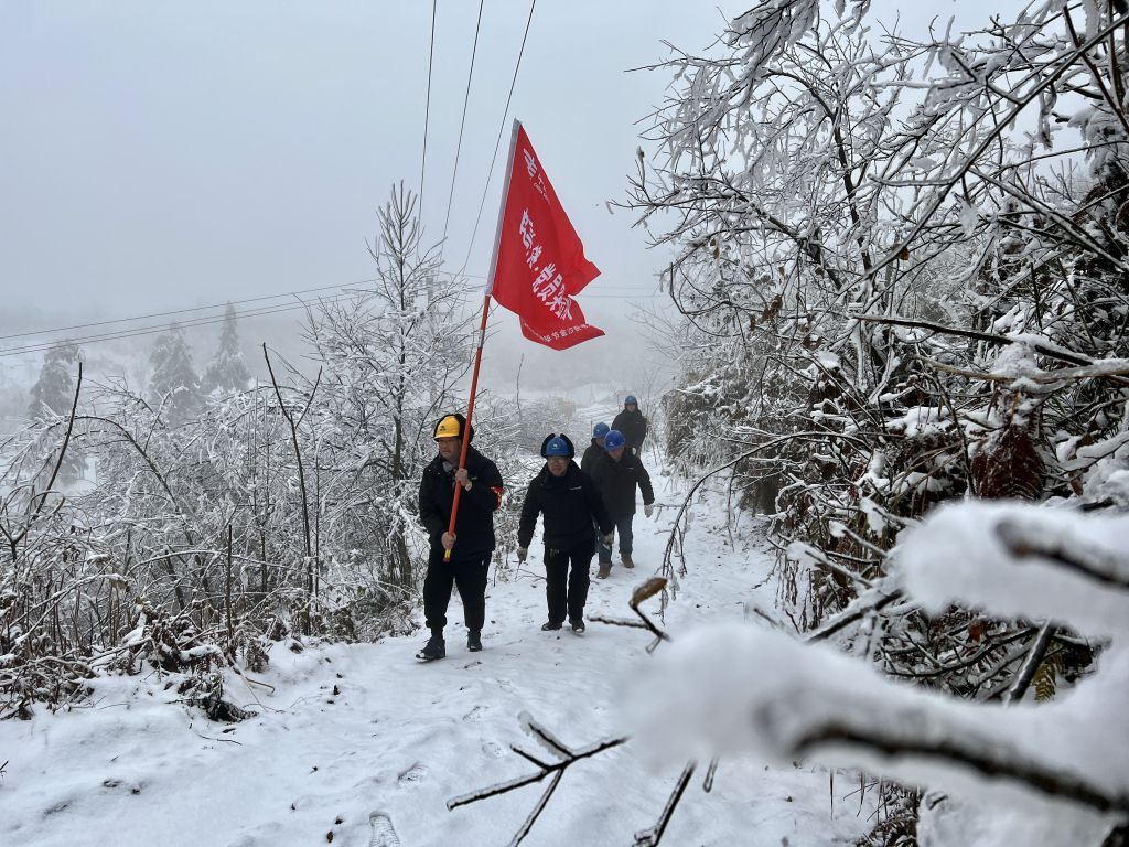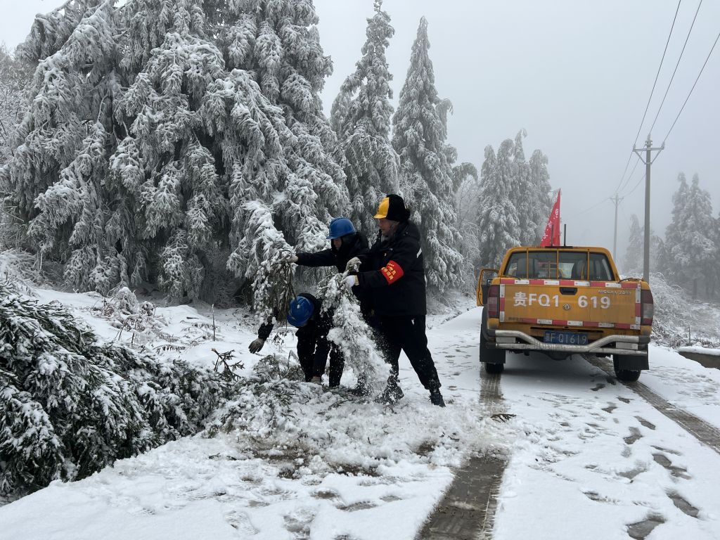 2022年2月7日,新一波冷空气侵袭贵州金沙县,毕节金沙供电局新安供电所党员先锋队巡视10千伏石笋支线,排查安全隐患,确保百坪等4个村供电正常。工作人员偶遇树木断裂阻挡公路,齐心协力清理交通要道树障,保障沿线老百姓通畅出行。