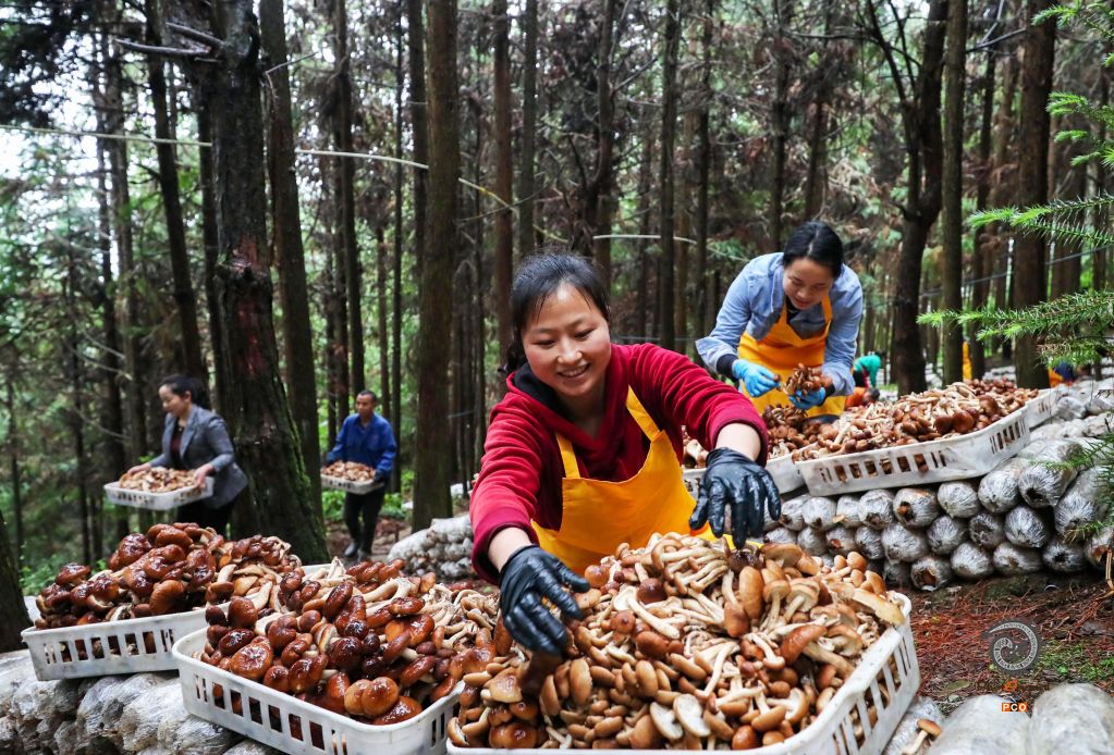坚持生态产业化、产业生态化,促进绿色经济持续增长。图为贵州省黔东南州岑巩县平庄镇平庄村村民在林下经济示范基地采摘茶树菇。