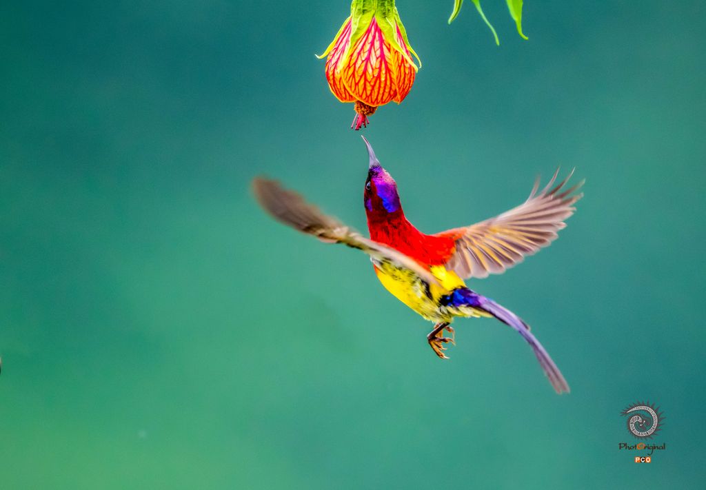 蓝喉太阳鸟 邓洪川摄(国家三有保护动物,素有“东方的蜂鸟”“月下老人”之美誉,因红黄蓝绿的羽翼闪现耀眼的光泽,夺目异常,故名“太阳鸟”,传说是凤凰神鸟的化身。贵州境内留鸟。)