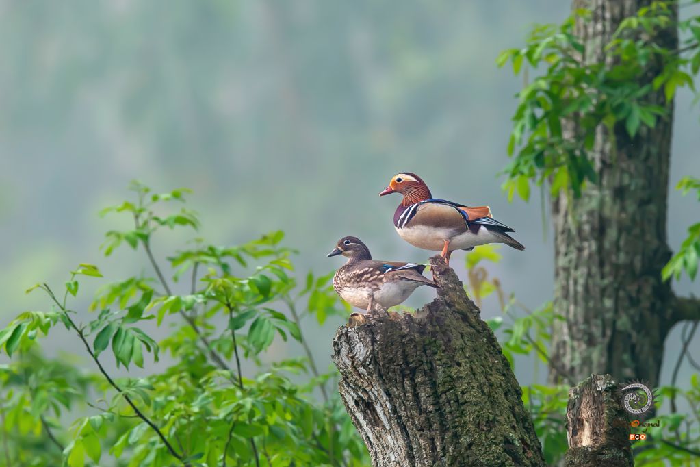 鸳鸯双栖 安金黎摄(国家二级保护动物,我国著名观赏鸟类,生性机警,极善隐蔽,飞行本领强,因雌雄常在一起而成为民间传说和文学作品中爱情的象征。贵州境内铜仁市石阡县是鸳鸯种群栖息数量最多的区域,主要分布于鸳鸯湖、凯峡河、洋溪河等河流湿地。)