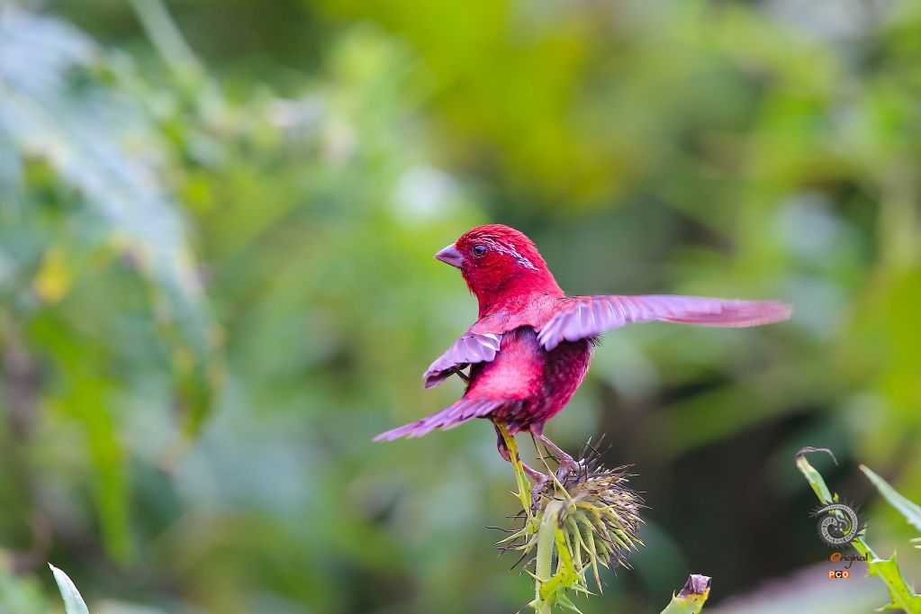 酒红朱雀 张玲生摄(国家三有保护动物,多在海拔2000米以上的山林中栖息活动,偶见于居民住宅附近的树丛与灌丛等开阔地带。贵州境内留鸟。)