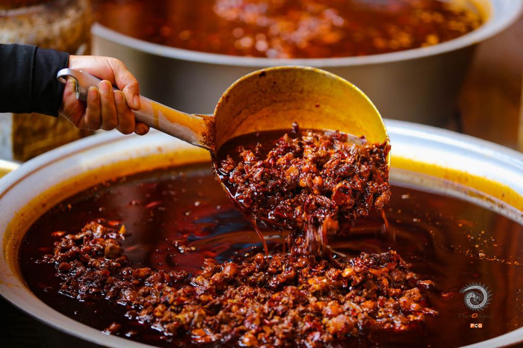 居民在展示制作好的屯堡美食鸡辣子》