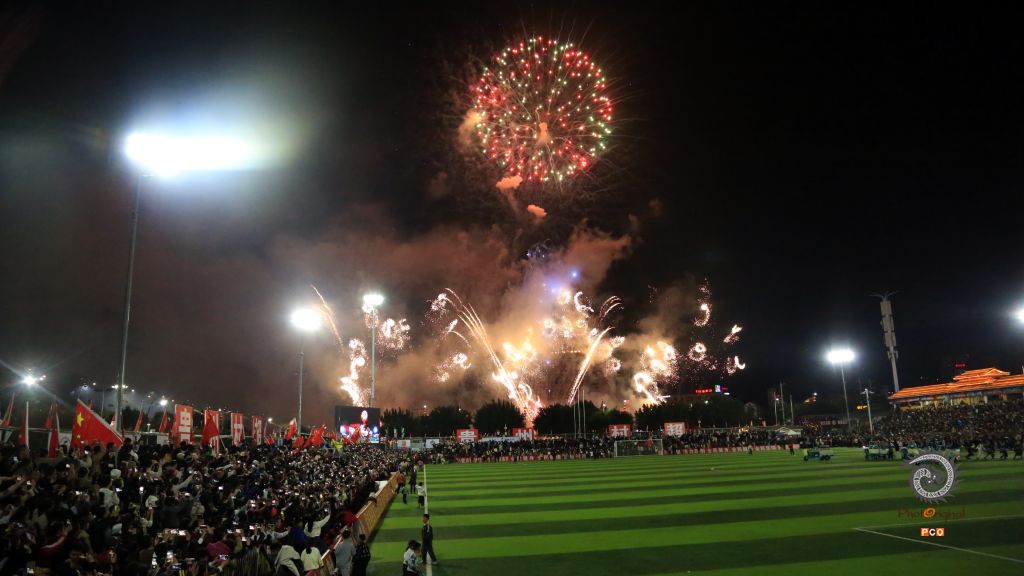 2024年3月16日,在贵州省黔东南苗族侗族自治州榕江县“村超”决赛阶段开幕式上,烟花璀璨,流光溢彩