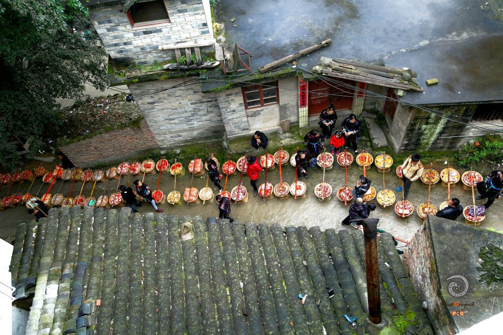 2015年3月26日拍摄于贵州黔东南苗族侗族自治州从江县高增乡高增村。侗族婚礼最奇特、最隆重的就是送新娘“回门”。“回门”即送新娘回娘家,送新娘回娘家时新郎不得随行,而由新郎家的兄弟姐妹和亲朋好友挑着彩礼,组成浩浩荡荡的队伍,送亲的队伍越长,表示新郎家的家业越兴旺。彩礼包括大米、五谷杂粮、鸡鸭、果蔬、各式糖果点心等。侗族人用食物的形式来表达对新娘的重视。食物越多说明对未来媳妇的肯定程度越高,侗族自古以来妇女地位就不一般,侗族地区盛行的“萨”文化就充分说明了这一观点。