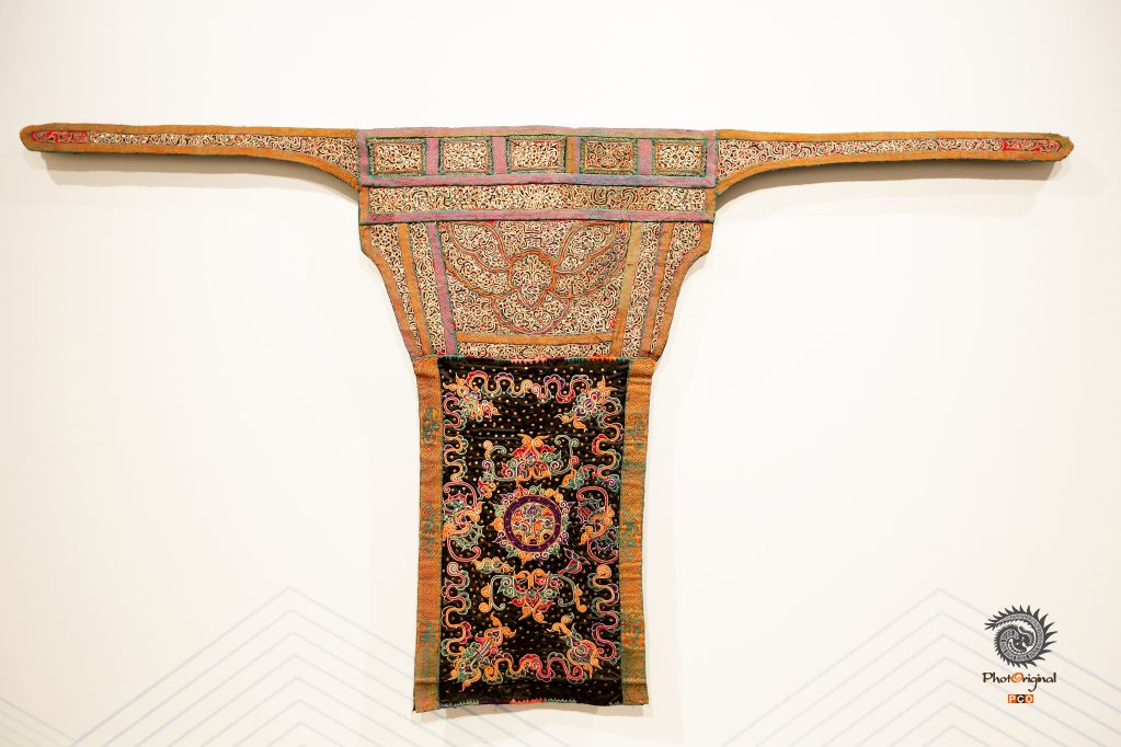 该背扇属于黄平苗族服饰圈,分布于黄平、凯里、施秉等地。主体纹样为古老的几何纹和蝴蝶纹。整体纹样工整对称、用色沉稳,色调统一。其数纱绣极具特色,针脚排列整齐,按经纬的交织点来计数,通常是绣出大量重复整齐排列的几何纹样和变形抽象的动植物纹样。除数纱绣外,还采用锁绣勾边,织锦带饰边。 传承人:杨玉林 主要工艺:数纱绣 布料为紫色染料加工的缎子。两端束带长达数米,便于背婴儿时捆绑,防止婴儿松落。 背扇是母亲给孩子最重要的礼物之一,一针一线寄托了母亲对孩子的爱和希望。