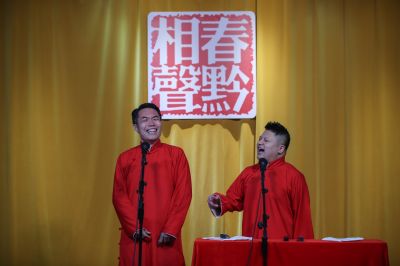 贵阳春黔社相声演员刘振峰、陈丹在进行表演