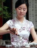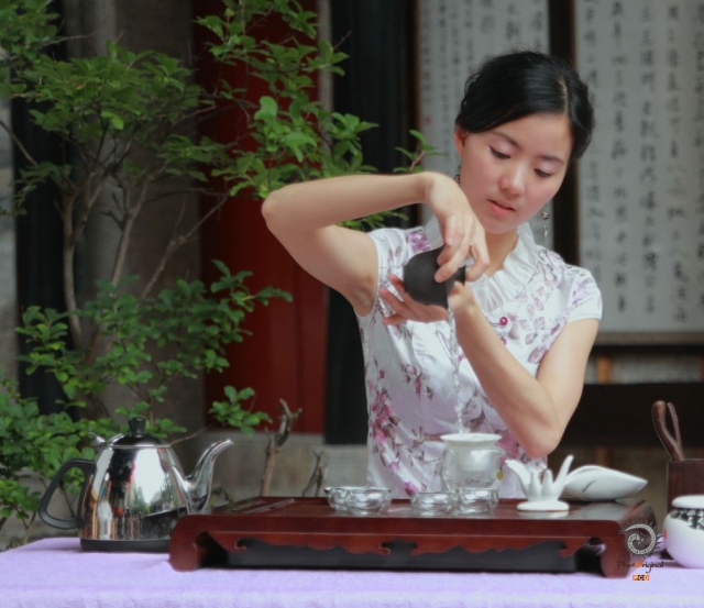 中国素有礼仪之邦之称谓,贵州茶文化的精神内涵即是通过沏茶、赏茶、闻茶、饮茶、品茶等习惯和中华的文化内涵礼相结合形成的一种具有鲜明中国文化特征的一种文化现象,也可以说是一种礼节现象。近年来,贵州省通过茶艺表演,在民众中提倡和推广科学健康的品茗方法,籍此提高国民素质和生活质量。图为石阡万寿宫内的苔茶品茗表演。