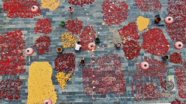 8月15日,贵州省锦屏县大同乡秀洞村村民在晾晒农作物(无人机照片)。 (2)2020年8月15日,贵州省锦屏县大同乡秀洞村村民在晾晒农作物(无人机照片)。(1/1)
