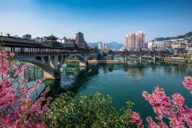 两座风雨桥跨过清水江、小江,樱花盛开的时节,二月的县城显得格外美丽。