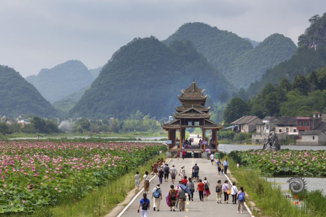 贵州省独山县下司镇长寿湖300余亩荷花竞相绽放,吸引不少游客前来游玩赏花拍照,图为游人在前往风雨桥赏荷。