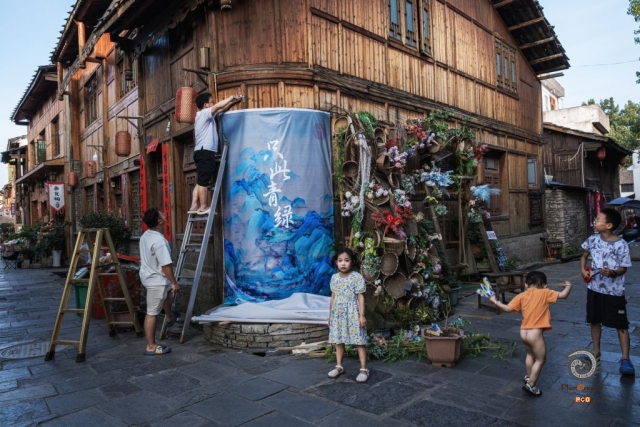 旧州古镇街头一景。古镇承载厚重历史,嬉戏的孩童,”只此青绿“的文创艺术,共处一个画面,展现古镇在当代传承发展的美好图景。