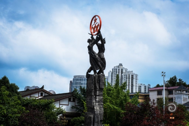 共擎双人托举的雕像,凸显群体协作,是安顺精神的体现。从历史底蕴(传统建筑)中生长,向现代(高楼)发展延伸,象征精神传承与时代创新的融合。(1/1)