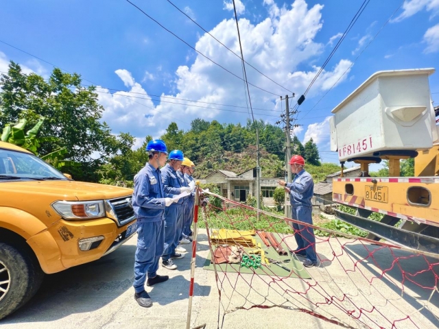 2022年8月4日,毕节供电局工作人员在金沙县桂花乡10千伏桂柿线五顶支线处开展带电作业,进一步缩小停电影响范围。图为带电作业工作班召开班前会。 拍摄时间:2022年8月4日 拍摄地点:贵州省毕节市金沙县桂花乡