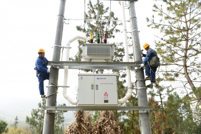 贵州电网公司员工实施农村电网巩固提升工程,图为供电员工安装变压器,提升辖区用电质量。(陈举 摄)陈举 摄(2/3)