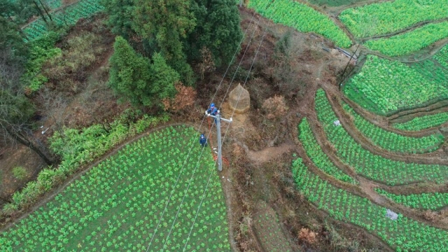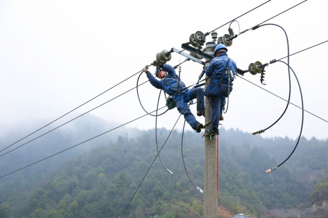 图为2月24日,南方电网贵州凯里麻江供电局工作人员在10千伏谷景线143号杆安装线路刀闸。(王春璇摄)贵州省黔东南苗族侗族自治州麻江县谷硐镇油菜花相继开放,处处生机盎然的景象。2月24日,南方电网贵州凯里麻江供电局组织工作人员趁着春日好时光,对运行年限较长的配网线路进行“高跳线路”隐患消缺,更换绝缘子、避雷器及拉线等老旧设备,为全年电网安全稳定打下坚实基础。(王春璇)(4/6)