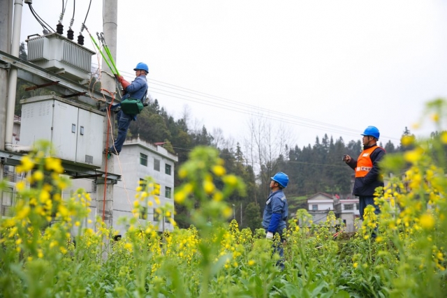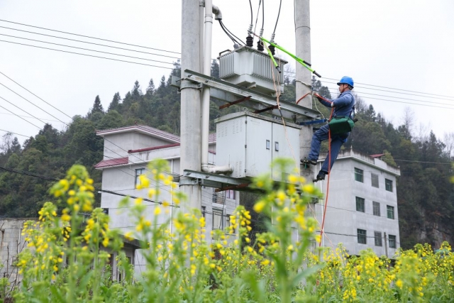 贵州省黔东南苗族侗族自治州麻江县谷硐镇油菜花相继开放,处处生机盎然的景象。2月24日,南方电网贵州凯里麻江供电局组织工作人员趁着春日好时光,对运行年限较长的配网线路进行“高跳线路”隐患消缺,更换绝缘子、避雷器及拉线等老旧设备,为全年电网安全稳定打下坚实基础。(王春璇)