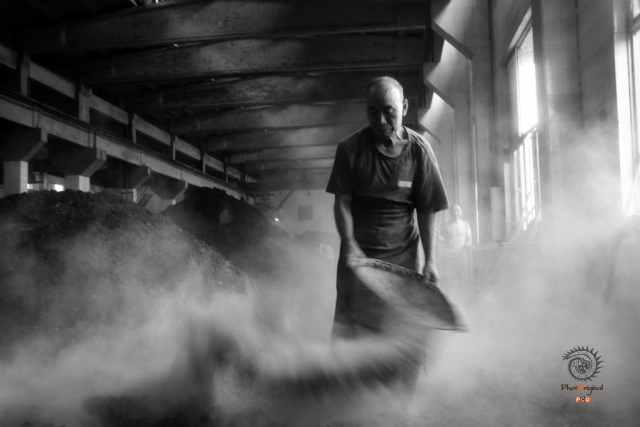 该照片拍摄于茅台镇的一个酿酒车间,酒师手持簸箕,均匀的摇撒着酒曲,曲药散漫于整个酿造车间,似云似雾,若隐若现,为酱香型白酒的酿造增添了一份神秘感。