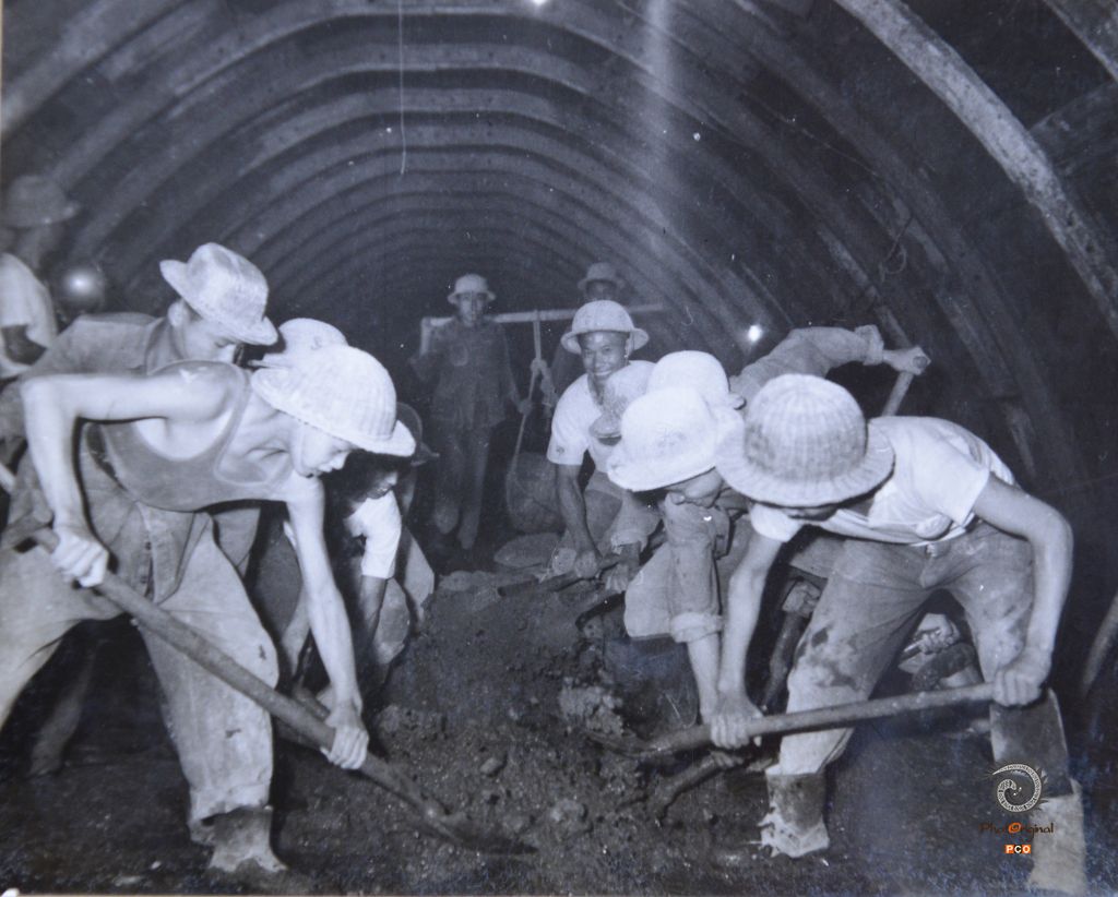 1970-1972年湘黔铁路大会战。二千米长的改子隧道内,民兵正在紧张的拌浆 冯玉照 摄