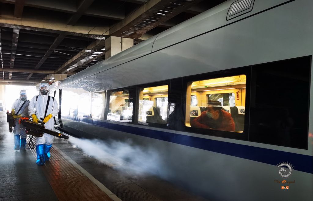 2020年3月20日,武汉的汉口火车站进行大规模消杀,一列从南充开往上海的列车在汉口站暂停,车上的乘客好奇地打量着消杀人员。曹旭 摄